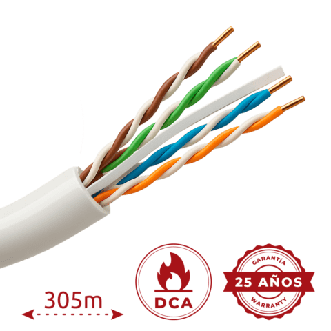 Cabo UTP rijo livre de halógenos – Categoria 6 – Atende com 90m Fluke test – Condutor OFC, pureza 99.9% cobre – Bobine de 305 metros – Diâmetro 5.5 mm