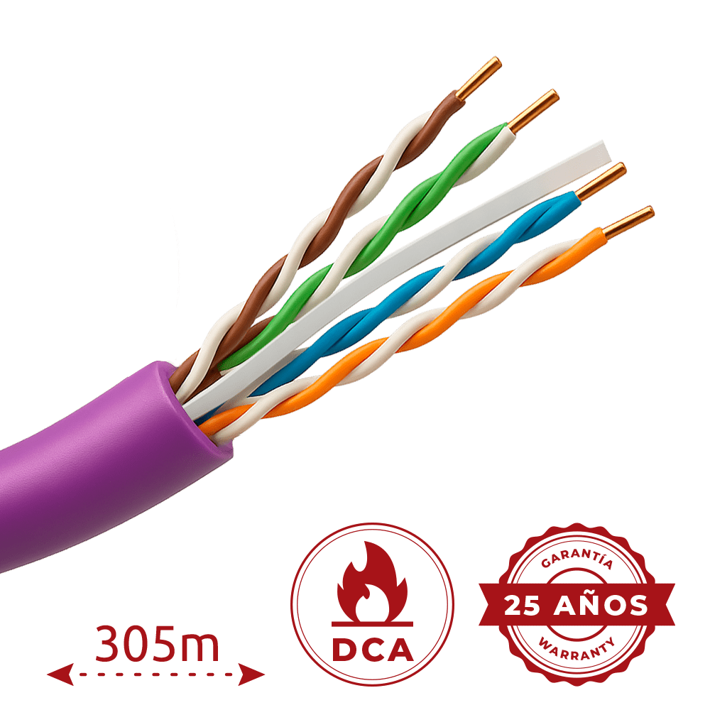 O UTP6-305-BC-LSZH-Dca-PU é um cabo de rede Cat6 U/UTP rígido, em bobina de 305 metros, com condutores de cobre sólido (BC) 24AWG,, isolamento PE e cobertura LSZH púrpura de baixa emissão de fumos (classe CPR Dca-s1,d2,a1),), concebido para instalações seguras em interiores.
