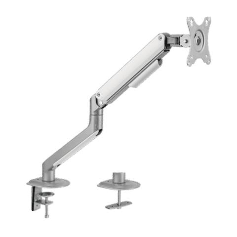 Um suporte de braço de mesa para monitor é um acessório concebido para suportar e ajustar ergonomicamente o monitor. Fixa-se à borda ou à superfície da secretária com uma base ou abraçadeira e permite que o monitor seja movido livremente em diferentes direções: altura, inclinação, rotação e distância.