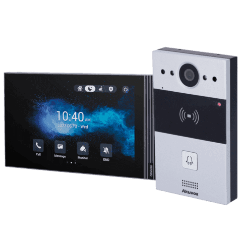 Kit de entrada de vídeo de superfície de porta Linux – IP | Placa e monitor – Áudio bidireccional Crystal Clear – Leitor EM/MF e NFC | PoE standard – 2 saídas de relé | Manutenção da Cloud – Ligação de monitor e placas via Cloud