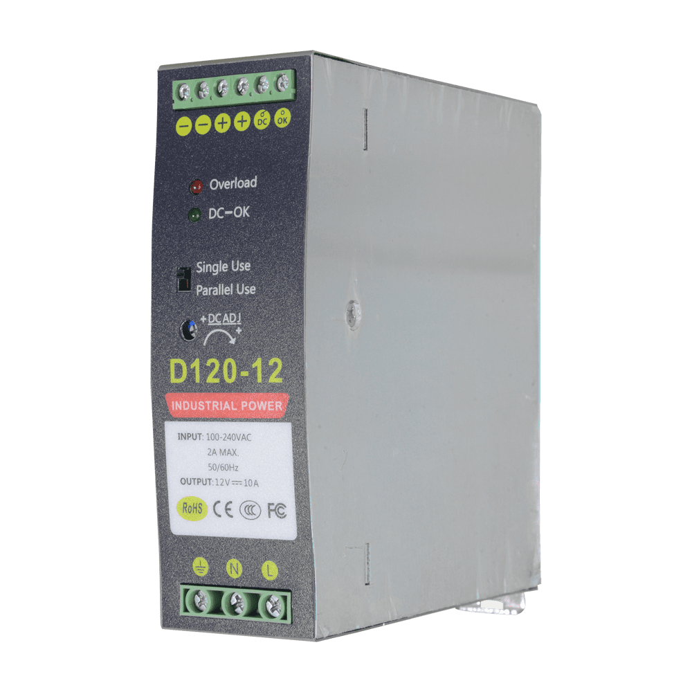Fonte de alimentação comutada – Saída DC 12 V 10 A / 120 W – 2 saídas – Voltagem entrada 90 V ~ 264 V – 135 (Fo) x 121 (Al) x 40 (An) mm – Montagem em carril DIN