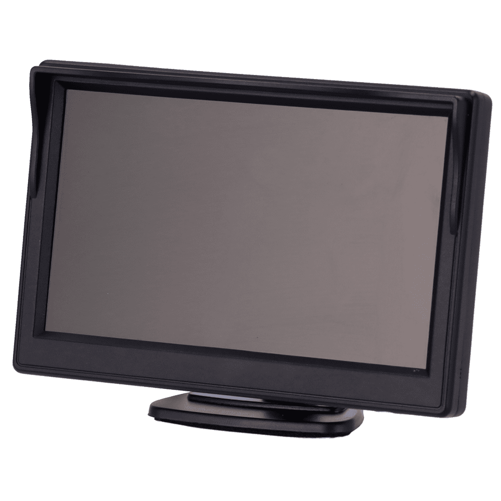 Monitor de 5 polegadas com suporte ajustável. Conector de vídeo M12 4pines e RCA. Resolução 480H, compatível com streamax, utilizado para visualização em direto de gravadores e dashcams de streamax.