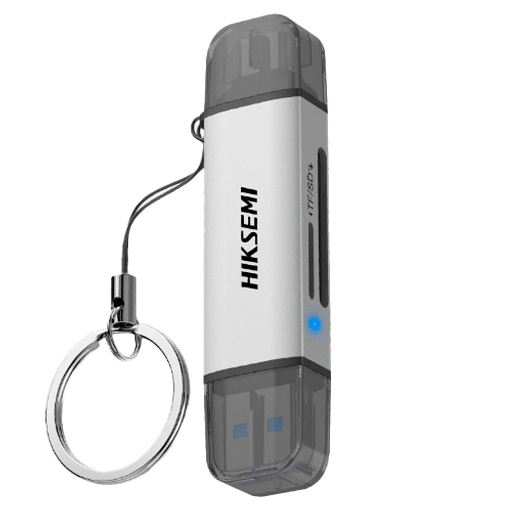 Leitor de cartões Hikvision – Entrada: cartão microSD e SD – Saída: USB A e USB C – Transferência de dados de 5 Gbps