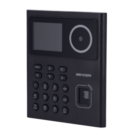 Controlo de acesso e presença – Facial, impressão digital, cartão MF e PIN – 500 utilizadores | 100.000 registos – TCP/IP, Wi-Fi e USB | Bateria de reserva – 2.4″ TFT | Controlador integrado – iVMS-4200 | Hik-Connect