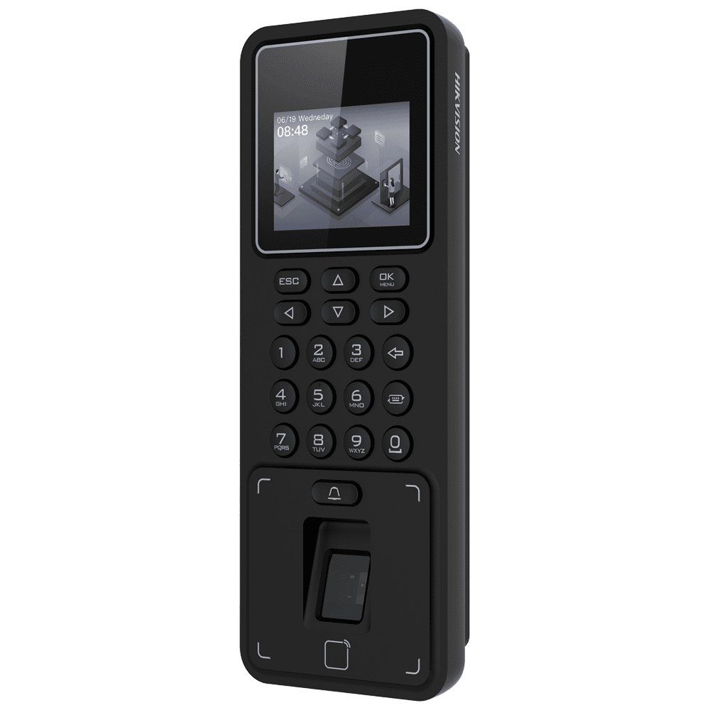 Controlo de acesso e presença – Impressão digital, cartão EM e PIN – 3.000 utilizadores | 100.000 registos – TCP/IP, WiFi, USB e RS485 – 2.4″ TFT | Controlador integrado – iVMS-4200 | Hik-Connect