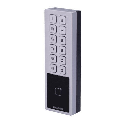 Controlo de acesso IP65 IK08 – Cartão MF e PIN – 3.000 utilizadores | 100.000 registos – TCP/IP, WiFi, RS485 e Wiegand – Controladora integrada – iVMS-4200 | Hik-Connect