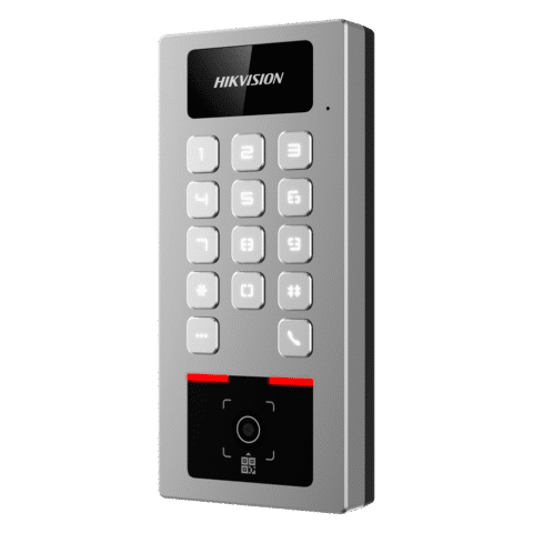 Controlo de acesso IP65 IK09 – Cartão MF DESFire, QR dinâmico e PIN – 10.000 utilizadores | 300.000 registos – TCP/IP, WiFi, RS485 e Wiegand – Controladora integrada – iVMS-4200 | Hik-Connect