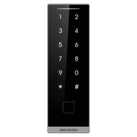 Leitor de acesso para armações – Acesso por cartão MF DESFire e PIN – Indicador LED e acústico – Wiegand 26/34 | RS485 – Compatível com os controladores Hikvision – Apto para exterior IP66