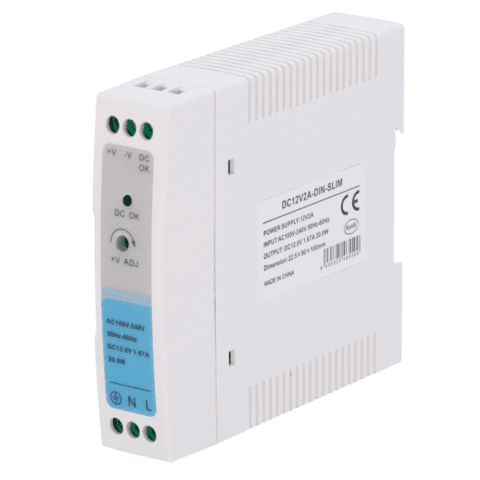 Fuente de alimentación – Salida DC 12 V 1.67 A / 20 W – Voltaje entrada 100-240VAC 50/60Hz – 23 x 100 x 92 mm – Montaje en carril DIN – Protección: Sobrecarga/Sobrevoltaje/Cortocircuito