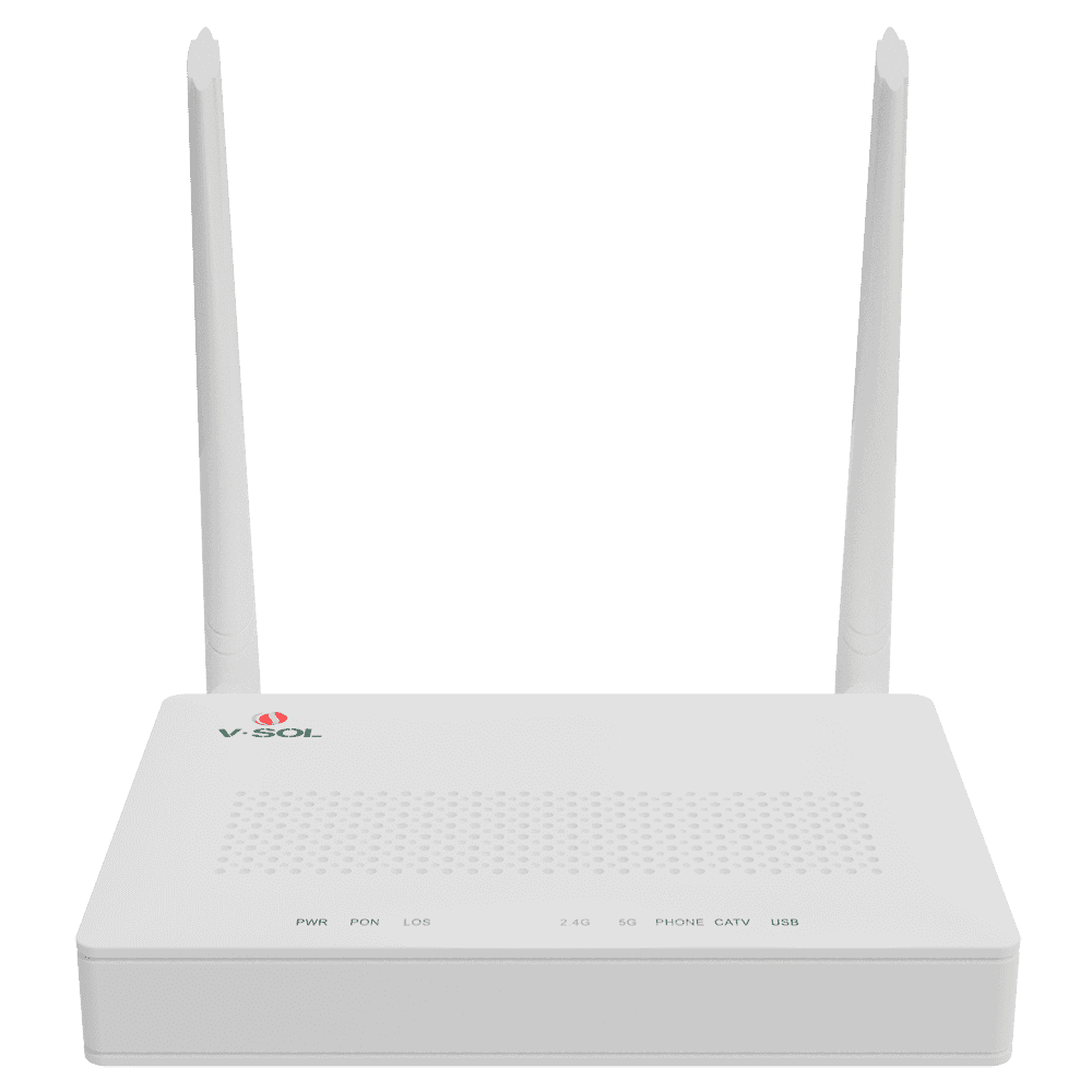 V-SOL Router ONT Wi-Fi 5 – 1X PON 4x LAN RJ45 GE 1x RJ11 1x CATV – 802.11ac 2×2 de banda dupla 2.4 e 5GHz – Ideal para FTTH doméstico e empresarial