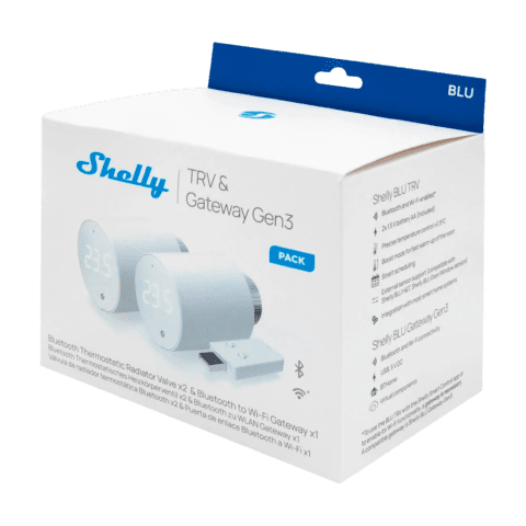 Shelly BLU TRV x2 + Shelly Blu Gateway Gen3 – WiFi 2.4 GHz IEEE802.11 b/g/n / Bluetooth – Cabeça termostática inteligente – Inclui HUB / Gateway – Controlo preciso da temperatura – Compatível com Alexa e Google