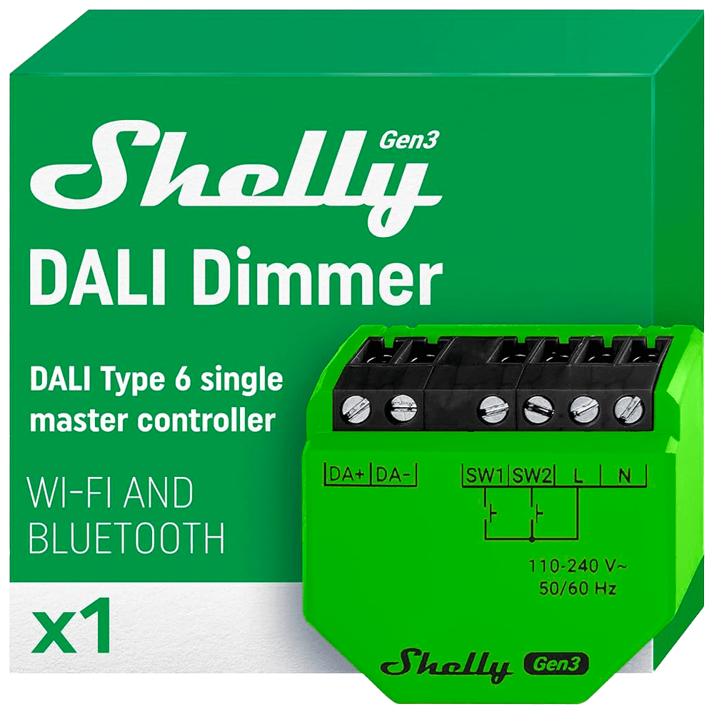 - Atua como uma ponte entre a rede de luzes DALI e o ecossistema Shelly
