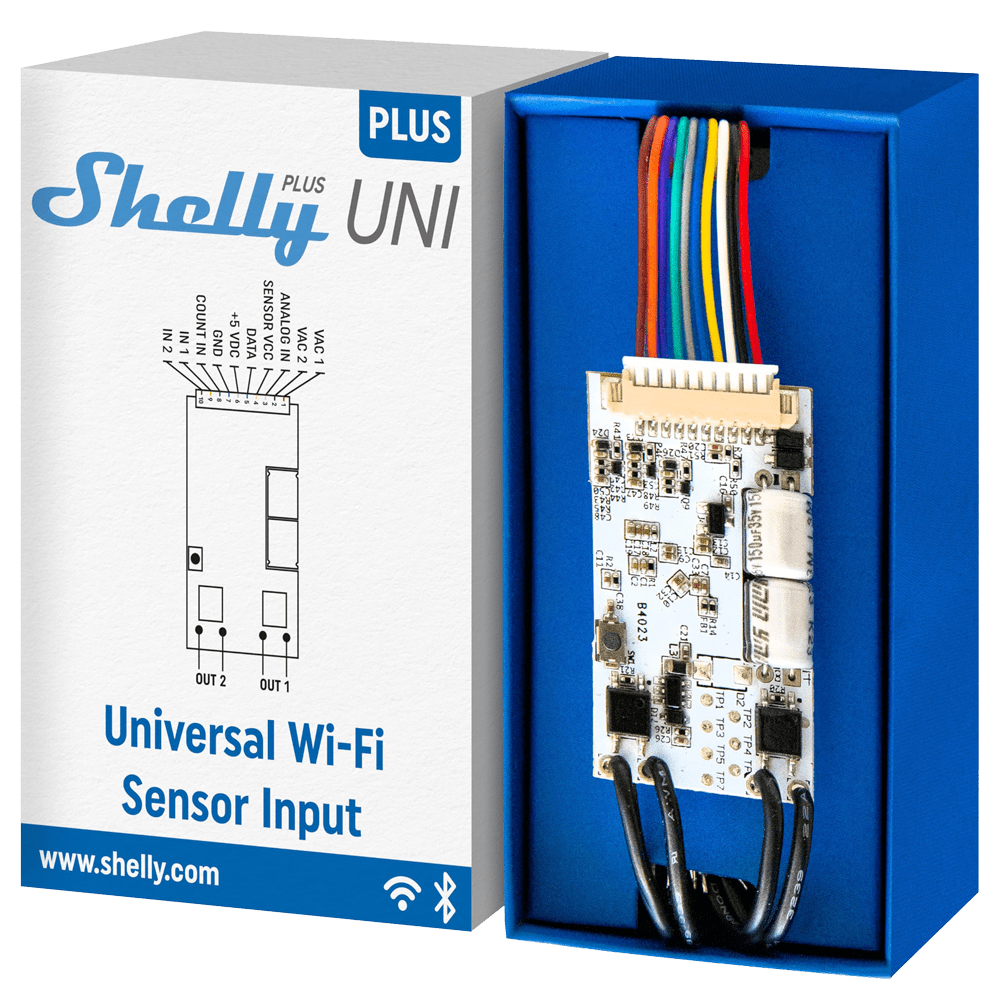 Shelly Plus Uni – WiFi 2.4 GHz IEEE802.11 b/g/n / Bluetooth – Módulo inteligente – Suporta 8-24 VAC / 9-28 VDC / 5 VDC – Fornece contactos secos – Compatível com Alexa e Google