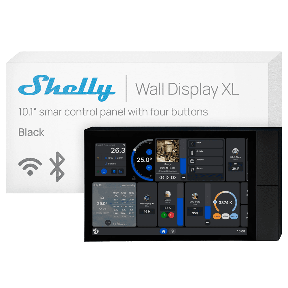 Shelly Wall Display XL Black – Wi-Fi 6 Dual Band / Bluetooth 5.4 – Sensor de iluminação – 4 botões físicos – Gerir o consumo – Compatível com Alexa e Google