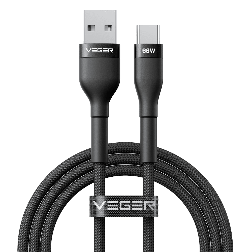 Veger – Cabo USB 2.0 para computadores portáteis – USB-A para USB-C – Revestimento metálico, Nylon trançado – Comprimento 1.2m – Carregamento rápido 66W : Cor preta