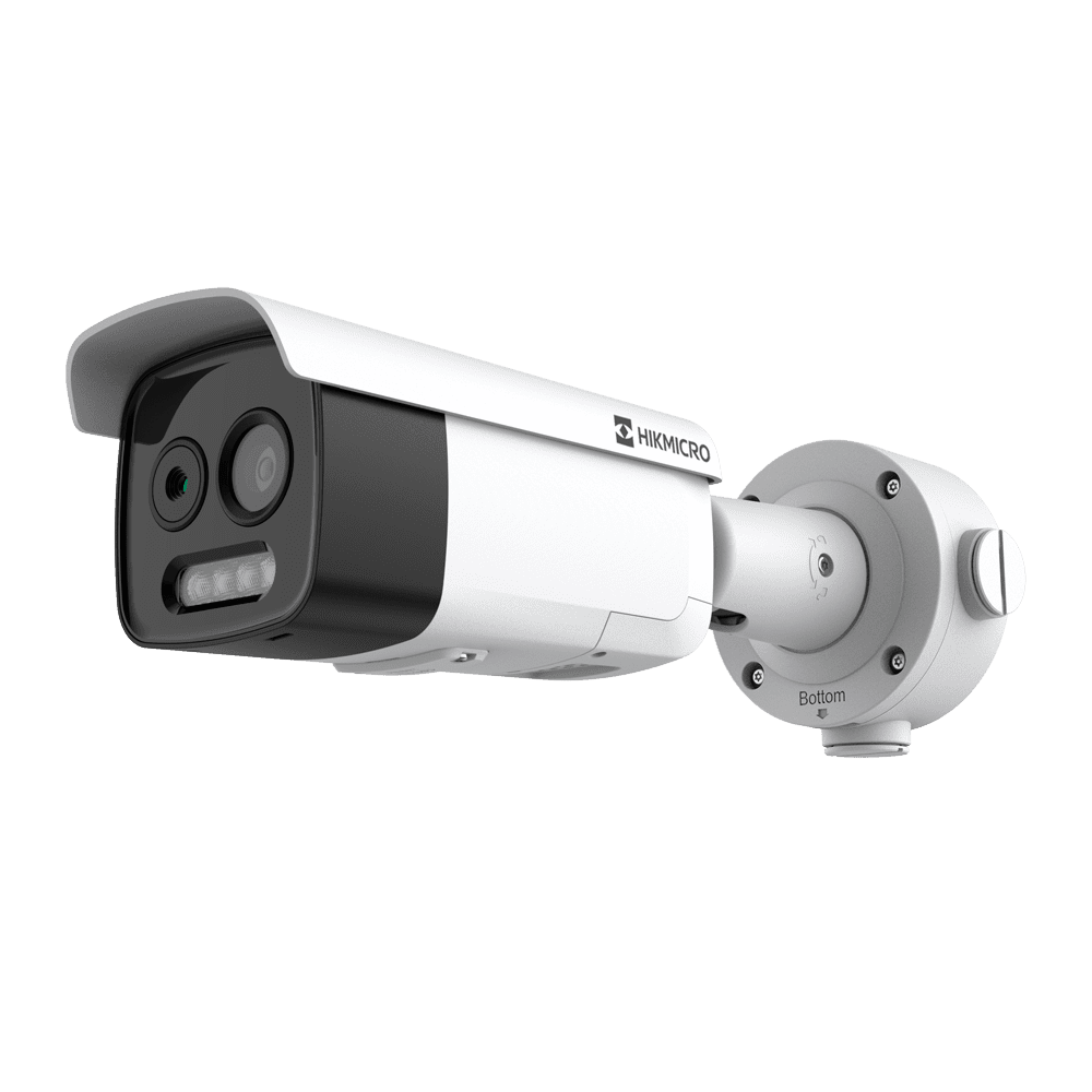 Câmara Térmica IP Dupla Hikvision Gama PRO – Sensor térmico 160×120 VOx | Lente 3.6mm – Sensor ótico 1/2.7 5Mpx | Lente 4.3 mm – Sensibilidade térmica 25mK (25°C, F1.0) – Deteção e alarme preventivos de incêndios – Intervalo de medição temp -20~150ºC / ±8ºC