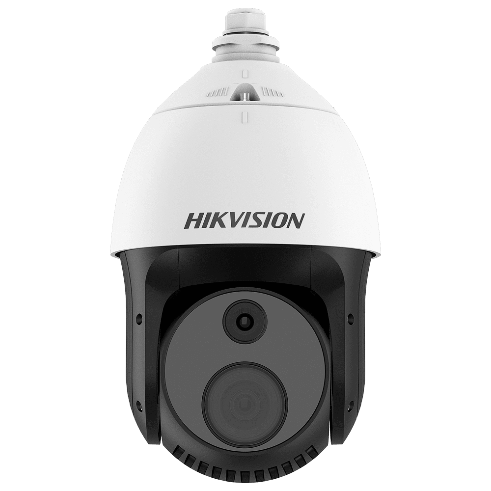 Speed dome térmica Dual IP Hikvision PRO – Sensor térmico 256×192 VOx | Lente 7 mm – Sensor óptico 1/2.8 4 Mpx | Lente 4.8~153 mm – Sensibilidade térmica 35mK | IP66 | Alarmes – Deteção e alarme preventivos de incêndios – Taxa de medição do tempo -20~550ºC / ± 2ºC