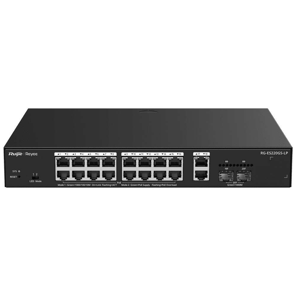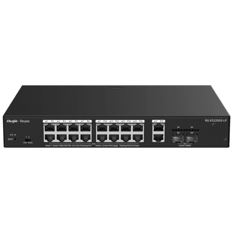 Reyee Manageable Cloud PoE Switch – 16 PoE 802.3af/at + 2 SFP + 2 uplink RJ45 – 18 RJ45 10/100/1000Mbps + 2 SFP 10/100/1000 – 30W por porta 802.3af/at / Máximo 130W – VLAN/Isolamento de portas/Detecção de loop – Limite de velocidade da porta