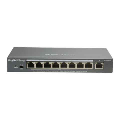 Reyee Switch PoE Cloud Gerenciável L2 – 8 portas PoE 802.3af/at + 1 Uplink RJ45 – 9 RJ45 10/100/1000Mbps + 1 RJ45 10/100/1000Mbps – 30W por porta 802.3af/at / Máximo 120W – VLAN/Isolamento de portas/Detecção de loop – Limite de velocidade da porta