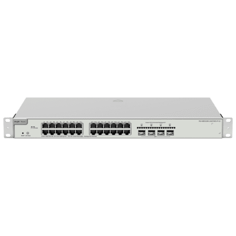 Reyee Switch PoE Cloud Layer 3 – 24 Portas PoE RJ45 Gigabit + 4 SFP+ 10Gb – 30W por porta 802.3af/at / Máximo 370W – Static LAG/DHCP Snoop/IGMP Snoop/Port Mirror – VLAN/Porta Isolation/STP/RSTP/ACL/QoS/802.1X – Servidor DHCP/Rotas estáticas/RIP/OSPF/SNMP