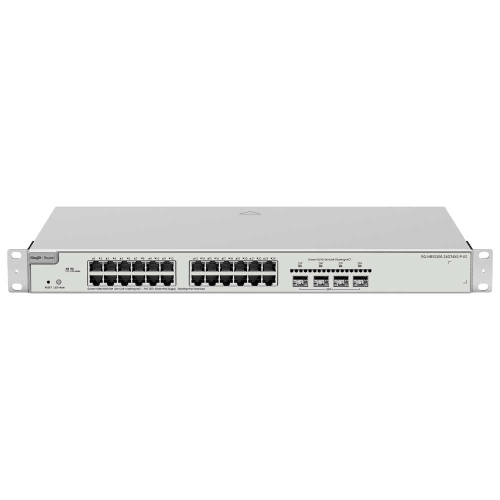 Alto desempenho: Com 24 portas Gigabit e 4 uplinks 10GbE SFP+, o RG-NBS5200-24GT4XS-P-V2 suporta um elevado volume de tráfego, ideal para redes Wi-Fi de alta densidade em escritórios, campus e ambientes com muitos APs.