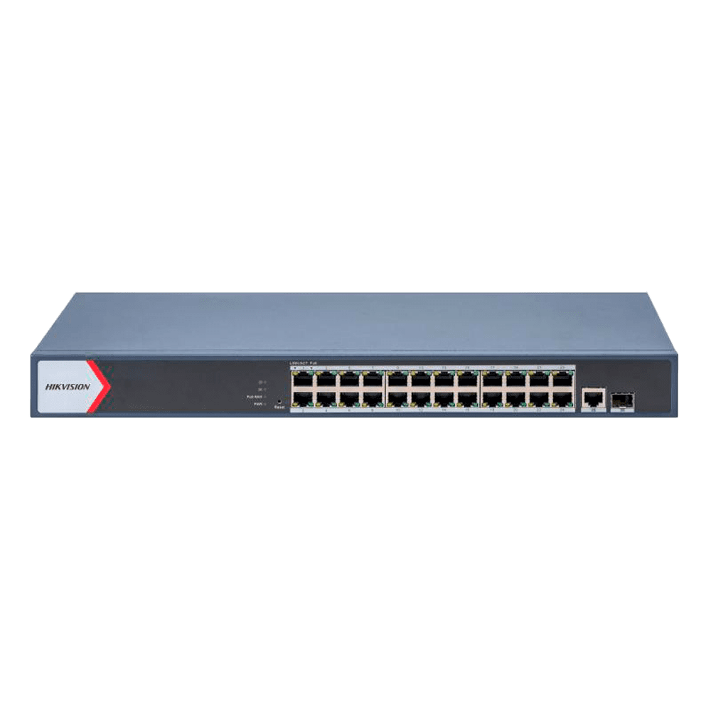 Switch PoE Hikvision – 24 portas RJ45 GE + 1 porta Gigabit RJ45/SFP – 24 Portas PoE+ 802.3af/at – Até 370w Potência PoE total – PoE Extended / PoE Watchdog / Isolamento de portas – Instalação em rack/parede/desktop