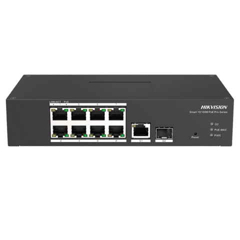Switch PoE Hikvision – 8 puertos RJ45 FE + 1 puerto Gigabit RJ45/SFP – 8 Puertos PoE+ 802.3af/at – Hasta 110w de Potencia PoE Total – PoE Extendido / PoE Watchdog / Port Isolation – Instalación en pared/sobremesa