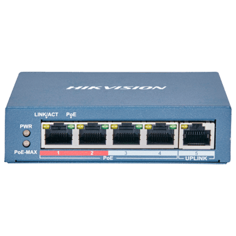 Desktop Switch da Hikvision – 4 Portas PoE + 1 Porta Uplink (RJ45) – Velocidade 10/100 Mbps – Até 65W no total para todas as portas – Compatível com PoE IEEE802.3af/at