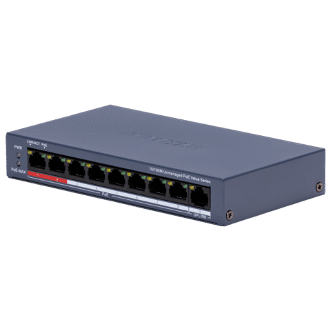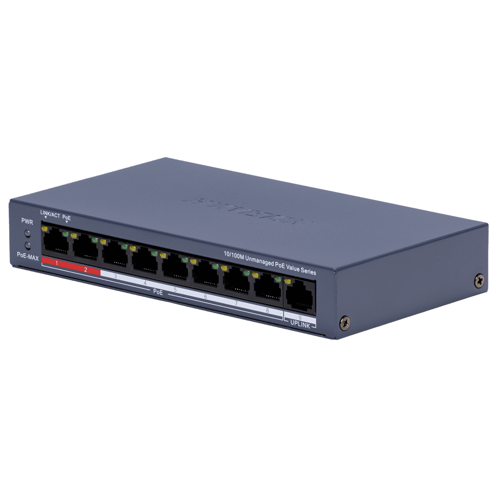 Desktop Switch da Hikvision – 8 Portas PoE + 1 Porta Uplink (RJ45) – Velocidade 10/100 Mbps – Até 80W no total para todas as portas – Compatível com PoE IEEE802.3af/at