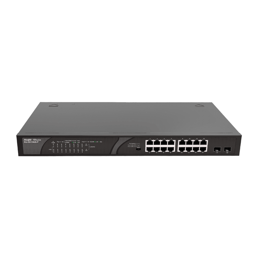 Reyee PoE Desktop Switch – 16 RJ45 Portas 2 + [%VAR%] Uplink SFP – 16 Portas Gigabit + 2 Portas Gigabit – 16 Portas PoE+ 802.3af/at | Potência total 247W – Isolamento de portas / Controlo de fluxo – Plug and Play