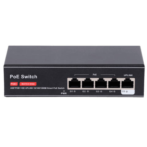 Switch PoE – 4 portas PoE + 1 Uplink RJ45 – Velocidade até 1000 Mbps em todas as portas – Até 60W no total para todas as portas – Largura de banda 10 Gbps – PoE IEEE 802.3 af/at