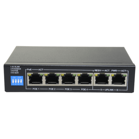 Switch PoE – 4 portas PoE + 2 Uplink RJ45 – Velocidade até 100 Mbps em todas as portas – Até 60W no total para todas as portas – Largura de banda 1.2 Gbps – Padrão IEEE802.3af (PoE) / at (PoE+)
