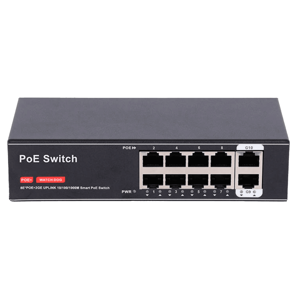 Switch PoE – 8 portas PoE + 2 Uplink RJ45 – Velocidade 10/100 Mbps + Uplink 1000Mbps – PoE IEEE 802.3 af/at – Até 100W no total para todas as portas