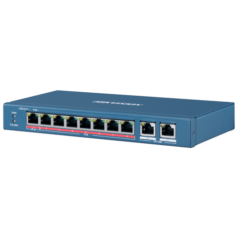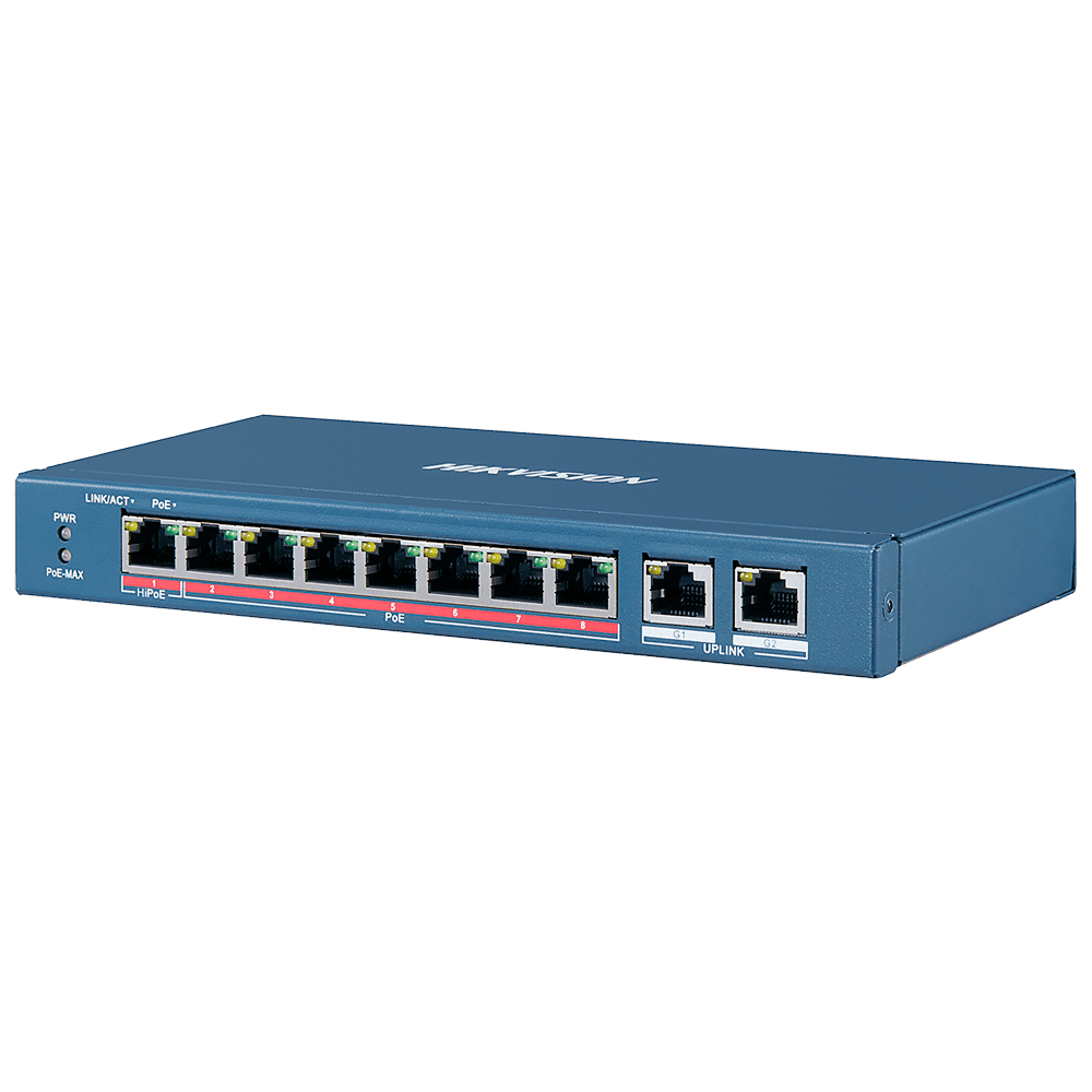 Switch PoE Hikvision – 8 portas 10/100 Mbps PoE + 2 Gigabit RJ45 – 1 Porta PoE+ 802.3af/at – Até 110W Potência PoE total – Instalação na parede ou na secretária – Gestão inteligente de PoE