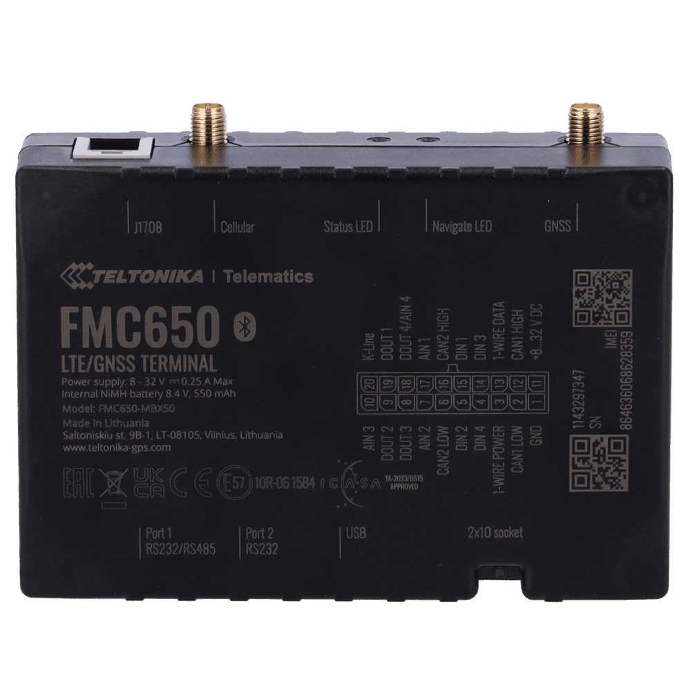 | Periféricos suportados | Garmin, RFID RS232, RFID 1-Wire, iButton 1-Wire, Temperatura 1-Wire, LV-CAN200, ALL-CAN300, CAN FMS (J1939, J1708), dados de linha K, sensor de pressão de pneus Continental, Iridium SBD (Iridium Edge/TSM232), congelador Carrier, modo de registo, NMEA, TCP ASCII/Binário, sensor de temperatura e humidade, compatibilidade com sensores BLE universais |