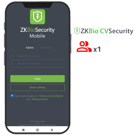 Licença da aplicação CVSecurity da ZKBio – Capacidade 1 do administrador – Gestão de utilizadores e eventos – Aberturas remotas – Adequado para Android e iOS – Necessária licença de acesso ZK-SOF-BIOCV-x